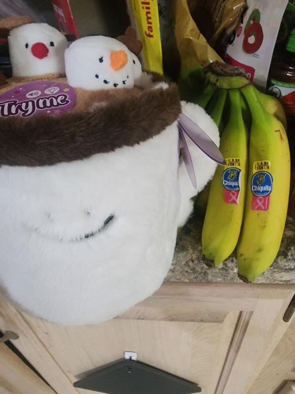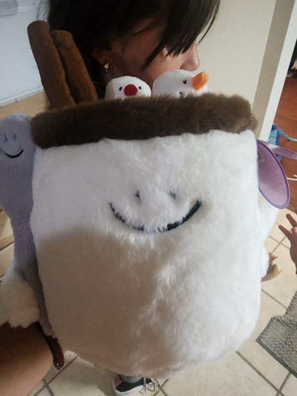 He is so cute and soft and adorable. This little hot chocolate plays music and is a nice size plushie. I have it sat on ym TV stand, and it looks so good. Just tap the top, and it starts playing a little tune for you. It seems to be durable and well made. I want all the different ones now.
