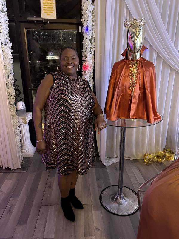Look party-perfect for your next special event when you wear Robbie Bee's plus size sleeveless dress, a swingy shift silhouette decorated with sparkling sequins and finished with a bow at the back for a charming touch.